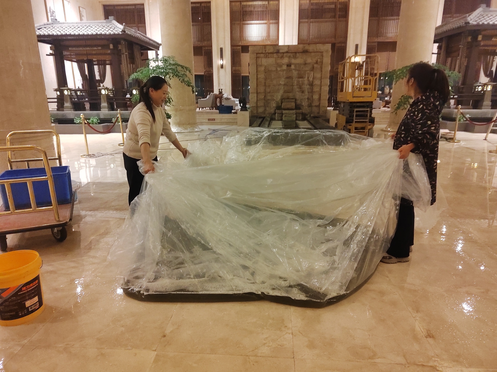 安徽铜陵金陵五星酒店大堂水晶灯清洗采用免拆洗技术